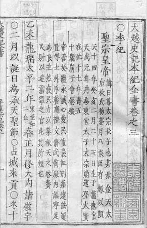 大 越 史 記 本 紀 全 書 卷 之 三 . [1a*1*1] Đại Việt Sử Ký Bản Kỷ Toàn Thư Quyển Chi Tam. 李 紀 . [1a*2*1] Lí KỶ. 聖 宗 皇 帝 . [1a*3*1] Thánh Tông Hoàng Đế. 諱 日 尊 太 宗 長 子 也 其 母 金 天 太 后 枚 氏 初 夢 月 入 懷 因 有 娠 以 順 天 十 四 年 癸 亥 二 月 二 十 五 日 生 于 龍 德 宮 天 成 元 年 爲 東 宫 太 子 太 宗 崩 遂 登 太 寳 在 位 十 七 年 壽 五 十 歲 崩 于 會 僊 殿 . [1a*3*5] [Huý Nhật Tôn, Thái Tông trưởng tử dã. Kì mẫu Kim Thiên Thái Hậu Mai thị, sơ mộng nguyệt nhập hoài, nhân hữu thần, dĩ Thuận Thiên thập tứ niên, Quý Hợi nhị nguyệt nhị thập ngũ nhật, sinh vu Long Đức cung. Thiên Thành nguyên niên, sách vi Đông Cung Thái Tử. Thái Tông băng, toại đăng thái bảo, tại vị thập thất niên, thọ ngũ thập tuế, băng vu Hội Tiên điện]. 帝 善 於 繼 承 誠 心 愛 民 重 農 恤 刑 柔 遠 邇 置 博 士 科 厚 養 廉 禮 文 脩 武 備 海 内 謐 寕 足 爲 良 主 然 疲 民 力 以 築 報 天 之 塔 費 民 財 以 造 霪 潭 之 宫 此 其 所 短 也 . [1a*6*1] Đế thiện ư kế thừa, thành tâm ái dân, trọng nông tuất hình, nhu viễn năng nhĩ, trí bác sĩ khoa, hậu dưỡng liêm lễ văn, tu vũ bị, hải nội mật ninh, túc vi lương chủ. Nhiên bì dân lực dĩ trúc Báo Thiên chi tháp, phí dân tài dĩ tạo Dâm Đàm chi cung, thử kì sở đoản dã]. 乙 未 龍 瑞 太 平 二 年 宋 至 和 二 年 . [1a*8*1] Ất Mùi, Long Thuỵ Thái Bình nhị niên [Tống Chí Hoà nhị niên]. 春 正 月 修 大 内 諸 殿 宇 二 月 以 誕 日 爲 承 天 聖 節 . [1a*8*14] Xuân, chính nguyệt, tu Đại Nội chư điện vũ Nhị nguyệt, dĩ đản nhật vi Thừa Thiên thánh tiết. 占 城 來 貢 . [1a*9*11] Chiêm Thành lai cống. 冬 十 . [1a*9*15] Đông, thập..